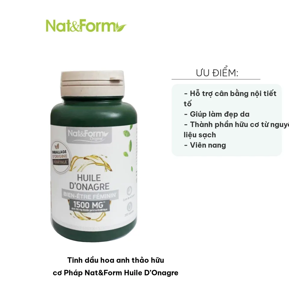 ➤ Tinh dầu hoa anh thảo Nat & Form Huile D’Onagre có hàm lượng tinh khiết cao, kết hợp tinh dầu anh thảo, tinh dầu hoa lưu ly và tinh dầu vitamin E. Viên nang nhỏ dễ uống, hấp thu nhanh, không gây tác dụng phụ.